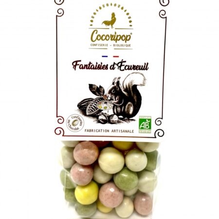 Ingrédients: Noisettes torréfiées* 32%, Chocolat au lait 32% (sucre*, beurre de cacao*, poudre de lait entier*, pâte de cacao*, poudre de vanille*), Chocolat blanc 32% (sucre*, beurre de cacao*, poudre de lait entier*, poudre de vanille*), (colorants naturels : poudre de fraise*, épinard*, curcuma*), mélange gomme d’acacia (sucre blond de canne*, miel*, fibre d’acacia*).